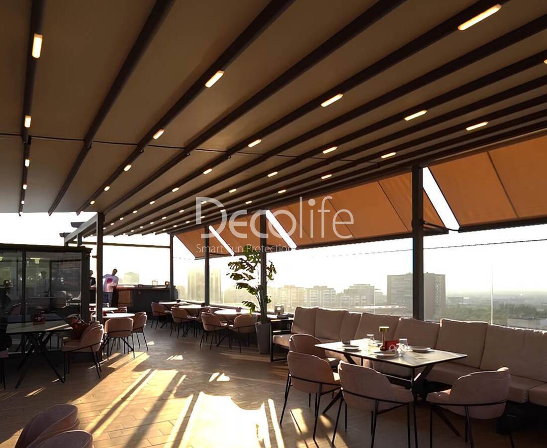 Тентовая пергола Decolife Basic&Pro New + маркизы G400, реализовано партнером "TENT VERTEX" - г. Алматы, отель "Grand Mildom"