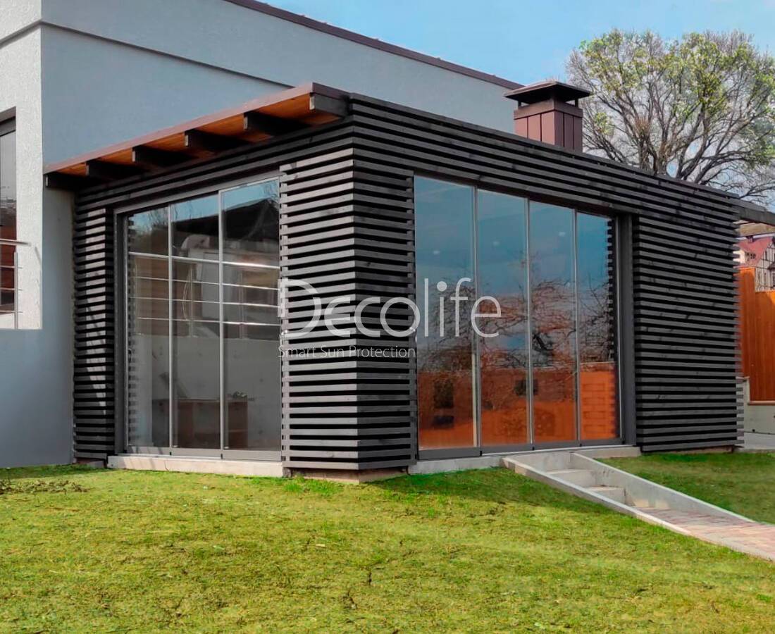Остекление выглядит благородно и красиво, обеспечивает комфорт во время нахождения на открытой площадке, даже если на улице холодно, идет дождь. Конструкции с максимальной высотой 3 м подходят для всех типов пергол Decolife, отличаются функциональностью и надежностью.